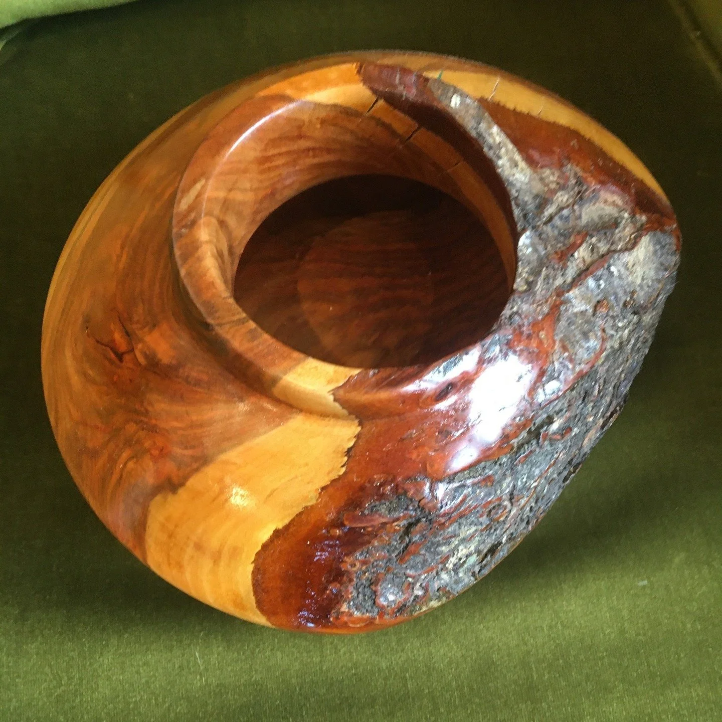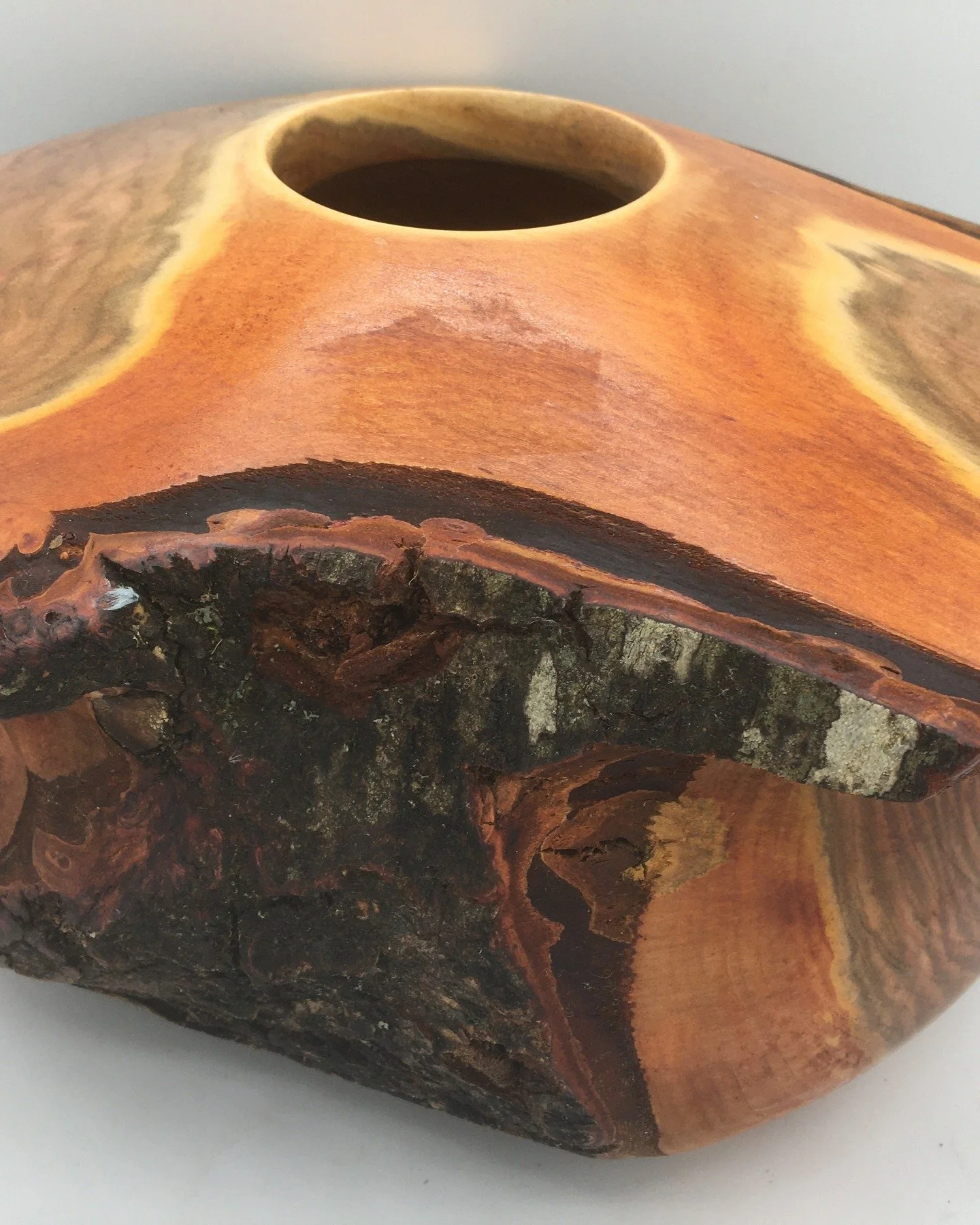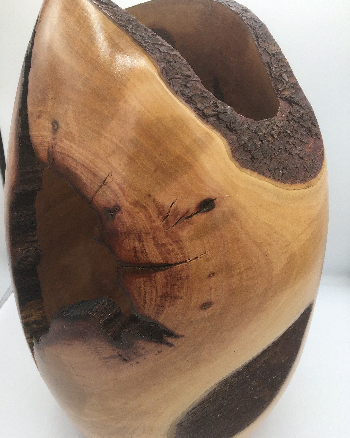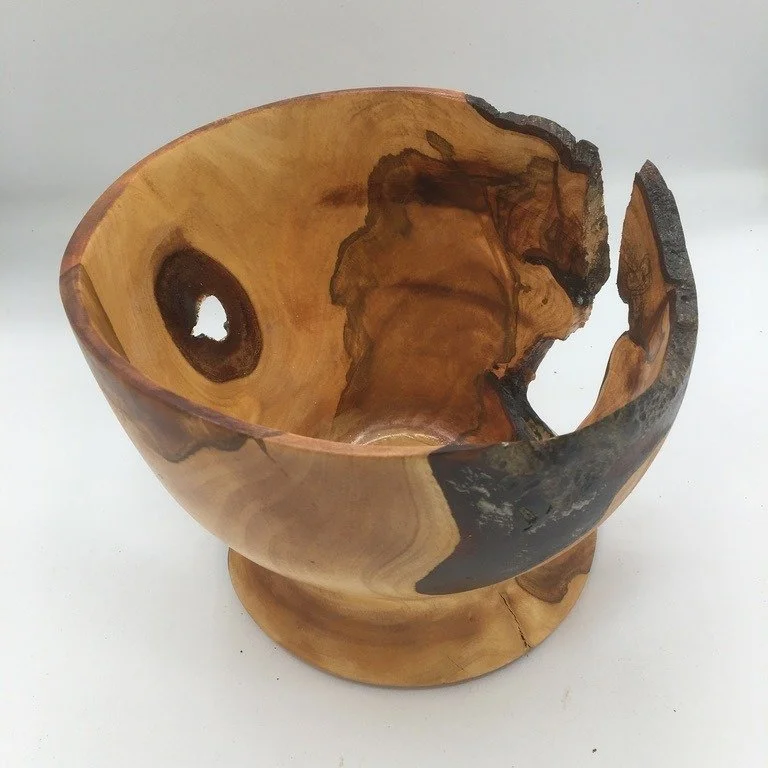 Turning rough found pieces of wood into art, Laurie seeks to highlight the natural characteristics of each piece—whether it's the live edge, knots, or bark—transforming them into sculptural vessels that showcase the wood's inherent beauty.